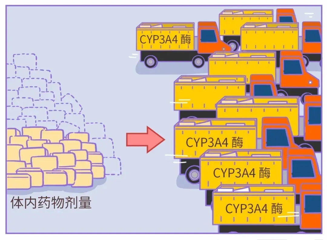 把吃进去的药念念象成一堆货品,CYP3A4酶就像是货车,渐渐把货品输送到体外,幸免货品在体内大批淹留。